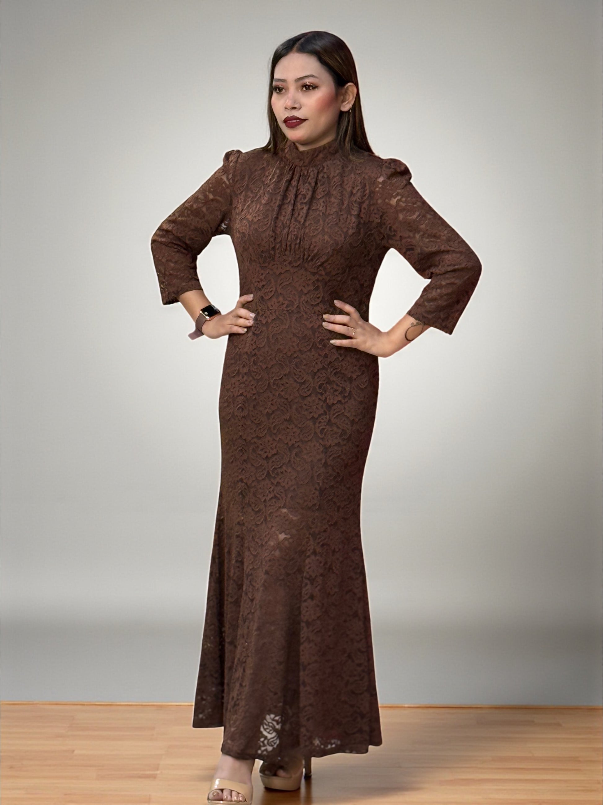 Elevate your style with this elegant lace maxi dress, available in three beautiful colors – Black, Brown, and Burgundy. Designed with a high neckline and three-quarter sleeves, this dress offers a sophisticated and graceful look for any special occasion. The intricate lace pattern adds texture and charm, while the fitted bodice and flowing hem create a flattering silhouette. Perfect for evening events, parties, or weddings, this dress pairs effortlessly with heels and accessories to complete your ensemble.